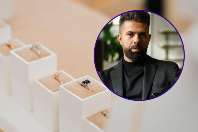 Tomasz Osman, prezes SAVICKI, w okręgu obok witryny z pierścionkami zaręczynowymi, w tym złotym z diamentami i srebrnym z szafirem. Ekspert z Super Biznes radzi, kiedy tańszy pierścionek okazuje się najdroższym wyborem.