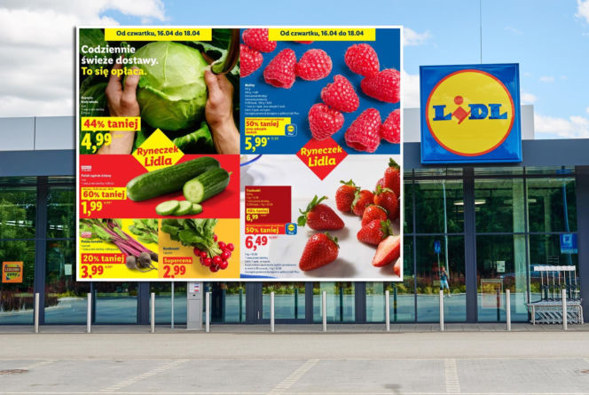 Plakat promocyjny sklepu Lidl na tle budynku placówki, przedstawiający ofertę "Ryneczek Lidla" z warzywami i owocami. Widoczne są kapusta, ogórki, botwina, rzodkiewki, maliny i truskawki z cenami promocyjnymi. Szczegóły dotyczące promocji w Lidlu na sezon grillowy znajdziesz na portalu Super Biznes.