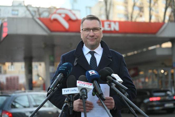 Konferencja Przemysława Czarnka na stacji paliw koncernu Orlen w Warszawie