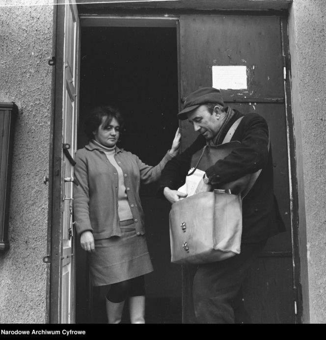Listonosz w czapce z torbą na ramię, wręczający korespondencję kobiecie stojącej w drzwiach domu, w czasach PRL. Zdjęcie z Narodowego Archiwum Cyfrowego ukazuje codzienne życie i pracę w Polsce Ludowej. Więcej o realiach PRL przeczytasz na Super Biznes.
