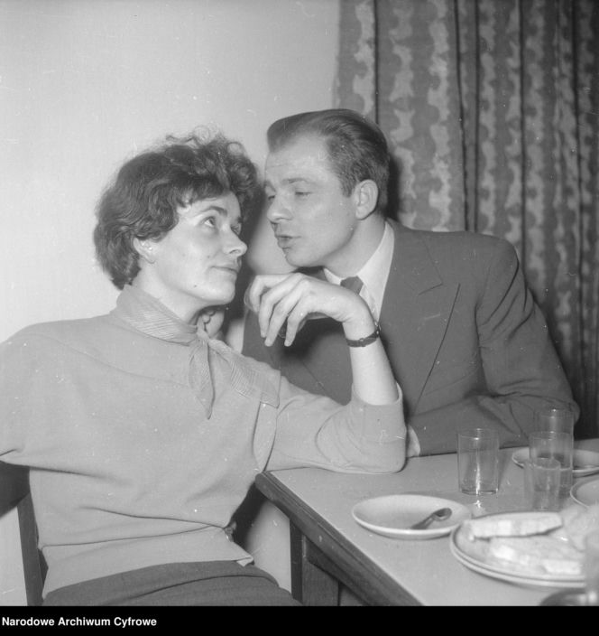 Młoda para, kobieta w jasnym swetrze z chustką na szyi i mężczyzna w garniturze, siedzi przy stole. On pochyla się, szepcząc jej coś do ucha, ona z zaciekawieniem na niego patrzy. Scena romantycznej randki w stylu PRL, nawiązująca do miłosnych hitów tamtych lat, o których przeczytasz na Super Biznes.