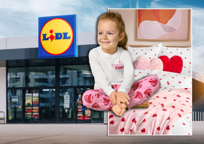 Dziewczynka w piżamie w serduszka siedzi na łóżku z pościelą w serduszka, obok fasady sklepu Lidl. Kolaż symbolizuje ofertę Lidla na Walentynki, o której można przeczytać w Super Biznes.